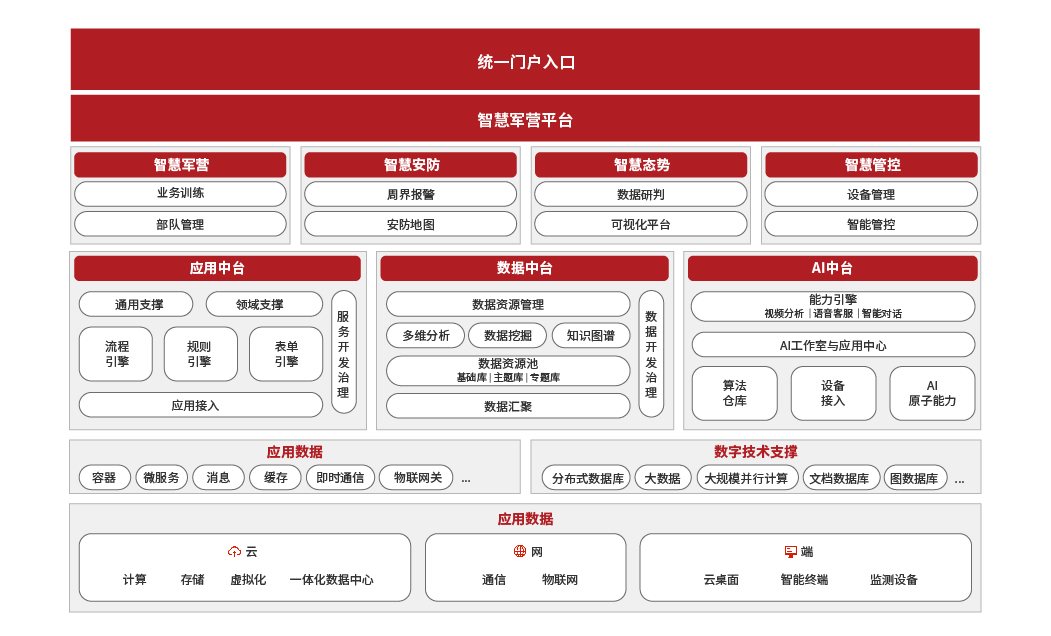 部隊管理系統 機關辦公系統 軍事教育系統 智慧政工系統 軍事訓練系統 后勤保障系統 智慧安防系統 裝備管理系統